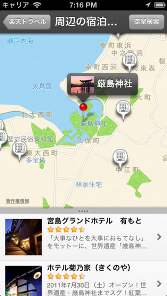 楽天トラベルはさらにGPS機能により、現在地周辺の温泉宿やホテルなどの宿泊施設を探すこともできます。ウィジェットを設定すれば自動的に近くのホテルをホーム画面に表示してくれるので、仕事で遅くなったときや飲みすぎて終電を逃してしまった際などに役立ちます。PCや他デバイスから予約の確認も「マイページ」で一元管理でき、同行者にあらかじめ情報をシェアしておきたいというときもURLシェア機能を使ってfacebook、mixi、メールなどで簡単に共有できます。